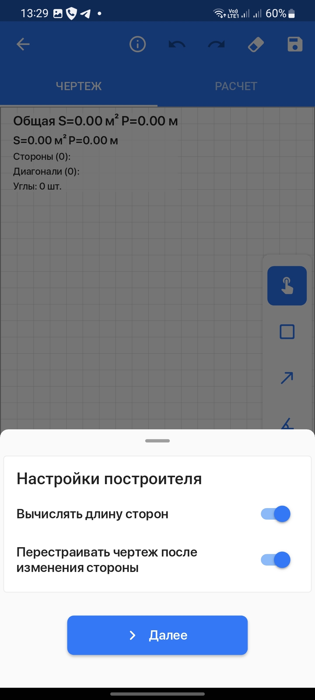 - Возможность вводить длину сторон и сразу переходить к следующей стороне с помощью кнопки «Сохранить и перейти к следующей стороне»